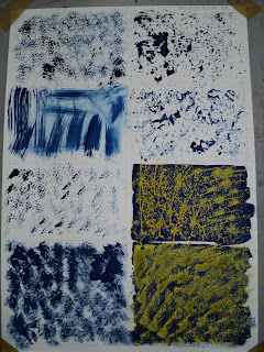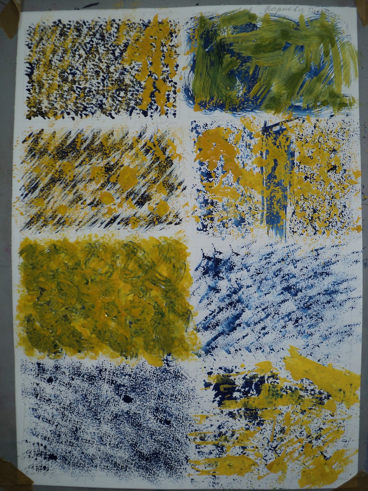 потренировались.. ))) теперь беремся за нашу композицию - использовать можно только 3 основных цвета синий, желтый, красный и плюс белый-черный. Фактуру наносим по одному цвету, второй слой кладем так чтобы не было механического смешения цветов