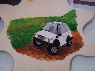 Все лучшие идеи конечно же приходят внезапно.. И вот вечерком накануне дня рождения одного хорошего человека.. нам (мне и Диме) пришла идея креативного подарка - взять давно приготовленные досточки для росписи (на случай когда дойдут руки), хорошенько шлифануть наждачкой и нанести тематический рисунок акриловыми красками. Тем же вечером доску выбрали, шлифанули и ближе к ночи разработали эскиз изображения. Рисунок выбирали из увлечений хорошего человека - бездорожье и его любимый сузуки эскудо. Нашлась фотка с поездки в горный алтай с пейзажем ледника актру и курайской степи, машину с фотки заменили на белый сузуки эскудо и вуаля!